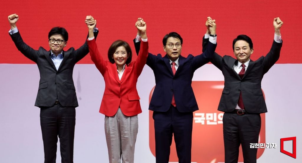 한동훈(왼쪽부터), 나경원, 윤상현, 원희룡 국민의힘 당 대표 후보들이 17일 경기 고양시 고양 소노 아레나에서 열린 제4차 전당대회, 서울 인천 경기 강원 합동연설회에서 손을 들어 인사하고 있다. 사진=김현민 기자 kimhyun81@