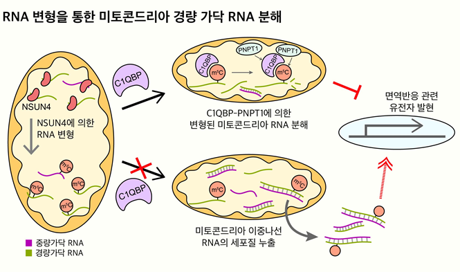 이를 통해 연구팀은 새로운 세포 내 면역 유발인자로 최근 주목받기 시작한 미토콘드리아 이중나선 RNA의 변형에 의한 발현 조절 기전을 제시할 수 있게 됐다고 설명했다.