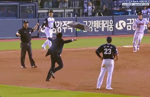 소동은 지난 19일 잠실구장에서 열린 LG트윈스와 두산 베어스의 경기에서 벌어졌다. 5회 말 LG 공격이 이어지던 중 한 남성이 외야 쪽에서 우산을 펼친 채 갑자기 등장해 그라운드를 달리기 시작한 것이다. 양복 차림의 남성은 두 팔을 하늘로 번쩍 든 채 질주했고 외야를 가로질러 내야까지 내달렸다.