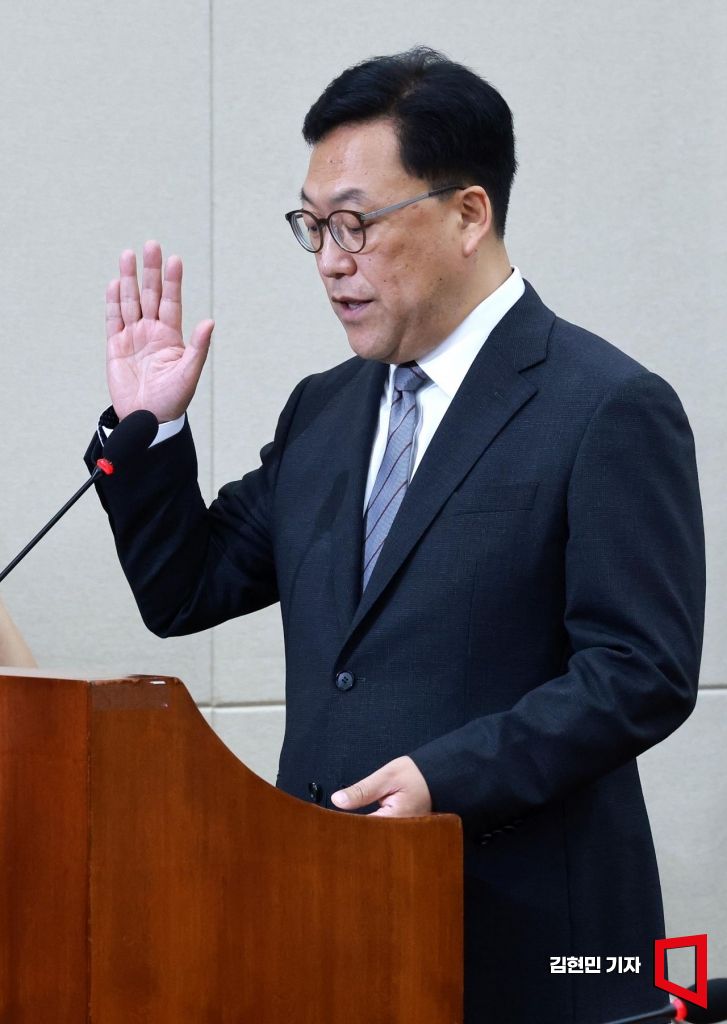 김병환 금융위원장 후보자가 22일 국회 정무위원회에서 열린 인사청문회에서 선서하고 있다. 사진=김현민 기자 kimhyun81@