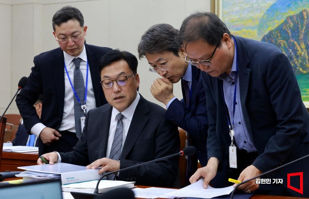 김병환 금융위원장 후보자가 22일 국회 정무위원회에서 열린 인사청문회에서 관계자들과 대화하고 있다. 사진=김현민 기자 kimhyun81@