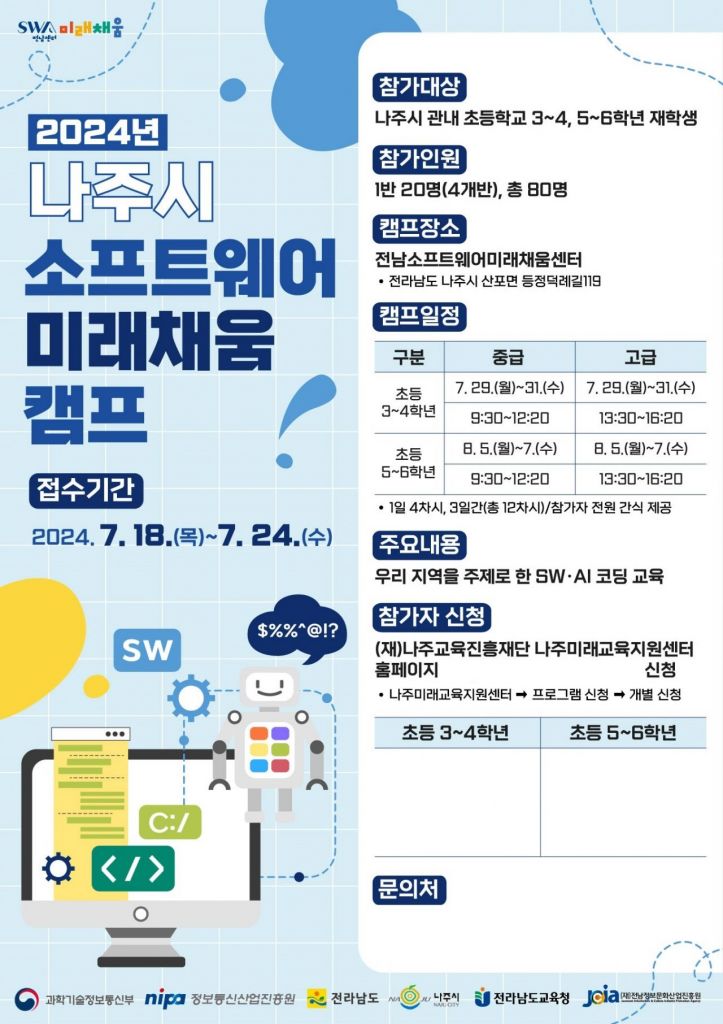 전남 나주시가 오는 24일까지 지역 초등학생들의 소프트웨어(SW) 기술 학습을 위한 ‘나주시 소프트웨어 미래채움 캠프’ 참가 학생을 선착순 모집한다.