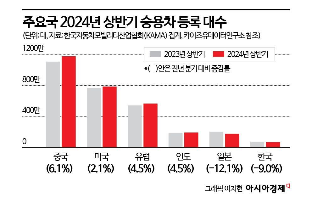 23일 아시아경제의 의뢰로 한국자동차모빌리티산업협회(KAMA)가 분석한 결과에 따르면 주요 6개 권역(중국·미국·유럽·인도·일본·한국) 내수 승용차 신차 등록에서 한국(-9%)과 일본(-12%)이 전년 대비 감소세를 보였다. 도요타 인증 조작 사태가 자동차 업계는 물론 사회 전반에 영향을 끼친 일본을 제외하면, 주요국 가운데 유일하게 한국의 내수 시장만 줄었다.