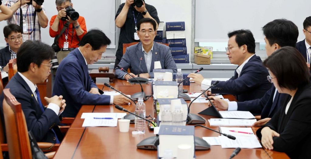김주영 국회 환경노동위원회 고용노동법안심사소위원장이 지난 18일 국회에서 열린 환노위 안건조정위원회에서 김형동 여당 간사를 비롯한 의원들이 언론 비공개에 항의하자 관련 사안을 놓고 대화하고 있다. 사진=김현민 기자 kimhyun81@