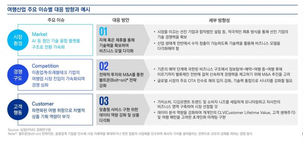 원정준 삼정KPMG 재무자문부문 전무는 “여행업계에도 AI 등 첨단 기술이 융합되는 동시에, 트래블테크 기업의 시장 진입으로 경쟁이 심화하고 있다”며 “종합 여행사 및 OTA 등 국내 여행업계는 가속화되는 디지털 전환에 대응해 기술 및 상품 기획 역량 제고에 나서야 한다. 유망 트래블테크 기업을 발굴해 전략적 M&A 기회를 모색해야 한다”고 짚었다.