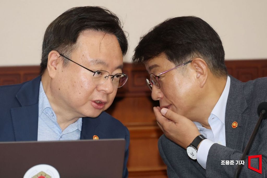 조규홍 보건복지부 장관(왼쪽)과 박상우 국토교통부장관이 23일 서울 종로구 정부서울청사에서 열린 국무회의에 참석, 대화를 하고 있다. 사진=조용준 기자 jun21@