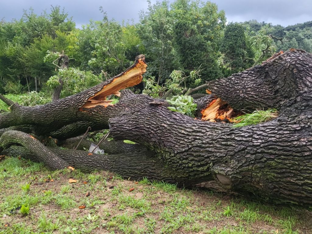 23일 연합뉴스에 따르면 이날 오전 1시께 포천시 관인면 초과리의 오리나무가 강풍과 폭우를 이기지 못해 뿌리째 뽑혀 쓰러져 있다는 신고가 포천시와 소방당국 등에 접수됐다. 포천시가 현장에 도착했을 때 이미 나무는 밑동이 부러진 상태였고, 나무를 지지했던 철근 지지대도 쓰러져 있었다.