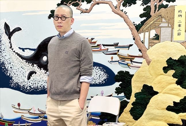 일본 화가 가쓰시카 호쿠사이에게 영감을 얻어 제작한 신작 '빅 피시(Big Fish)' 앞에 선 우국원 작가. [사진제공 = 탕컨템포러리]