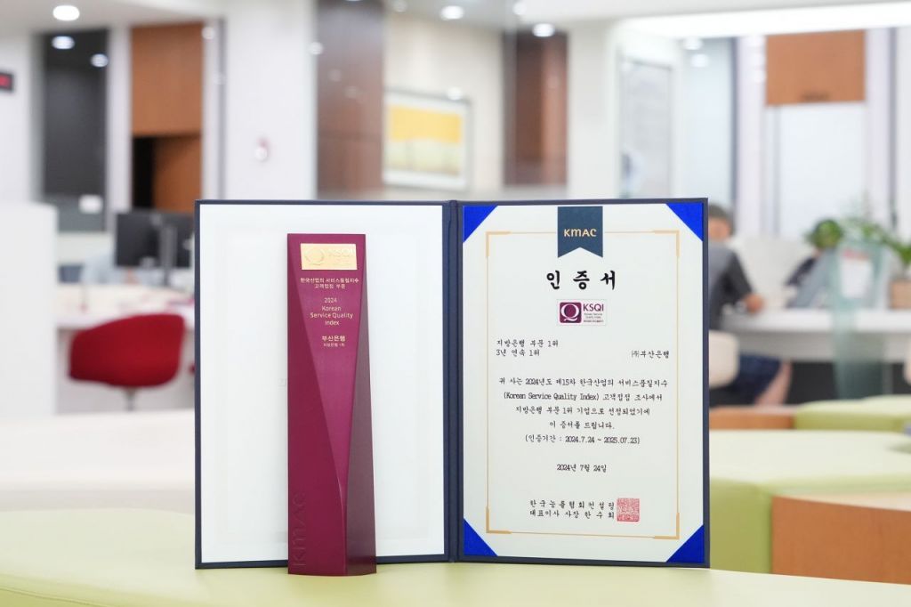 BNK부산은행(은행장 방성빈)은 24일, 한국능률협회컨설팅(KMAC)이 발표한 ‘2024년도 한국산업의 서비스품질지수(KSQI:Korean Service Quality Index) 고객접점 부문’ 지방은행 산업 부문에서 3년 연속 서비스 품질 1위 기업으로 선정됐다고 전했다.