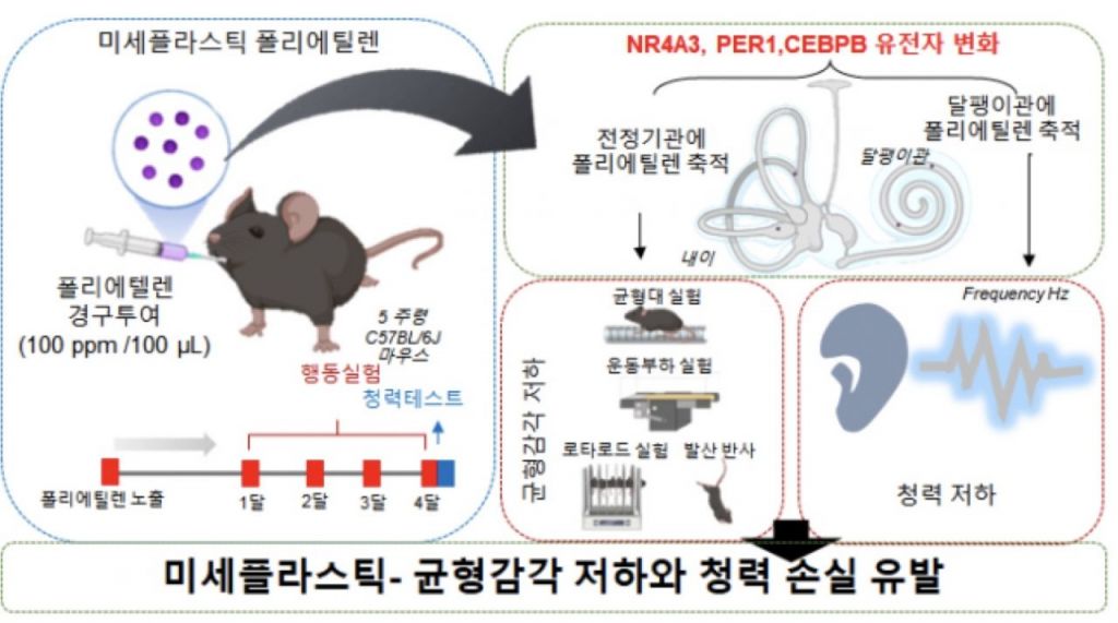 귀의 내이를 구성하는 달팽이관(청력 담당)과 전정기관(균형감각 담당)에 폴리에틸렌이 0.144마이크로그램 축적된 것을 확인한 후 진행한 청력 측정시험에서 정상군은 31.7데시벨, 폴리에틸렌 섭취군은 54데시벨에 반응했다. 연구팀은 폴리에틸렌 섭취군이 정상군보다 22.3데시벨 더 큰 소리에 반응한 것을 폴리에틸렌에 의한 청력 기능 손상으로 확인했다.