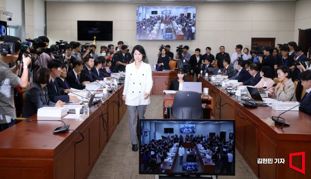 이진숙 방송통신위원장 후보자가 24일 국회 과학기술정보방송통신위원회에서 열린 인사청문회에서 선서문을 제출한 뒤 자리로 돌아오고 있다. 사진=김현민 기자 kimhyun81@