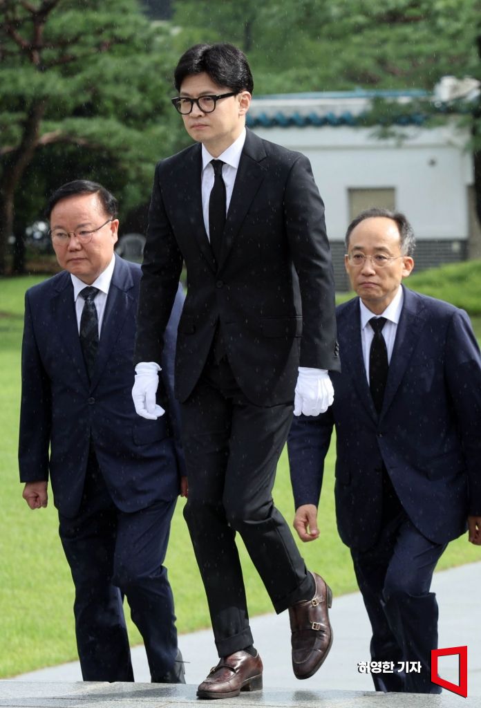 한동훈 대표를 비롯한 국민의힘 신임 지도부 의원들이 24일 국립현충원을 참배했다. 한 대표와 의원들이 현충탑으로 걸어가고 있다. 사진=허영한 기자 younghan@