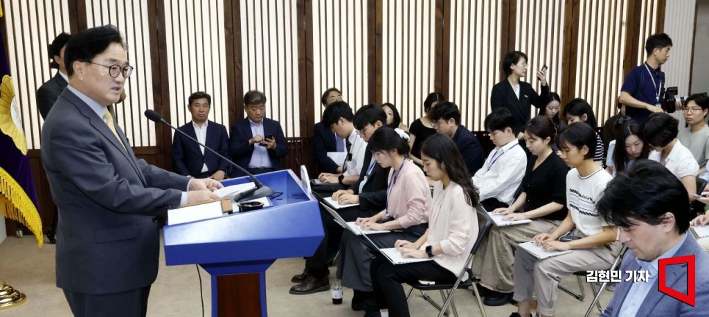 우원식 국회의장이 24일 국회에서 방송법 중재안 등 국회 현안 관련 긴급 기자회견을 하고 있다. 사진=김현민 기자 kimhyun81@