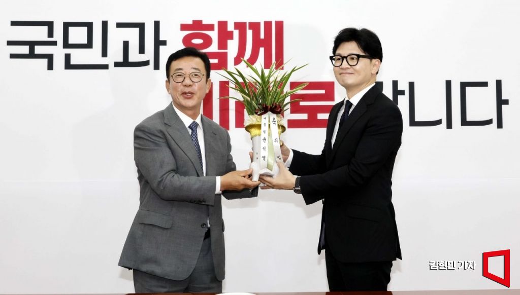 한동훈 국민의힘 대표가 24일 국회에서 홍철호 대통령실 정무수석을 접견하고 있다. 홍 수석은 윤석열 대통령이 보낸 취임 축하 난을 한 대표에게 전달했다. 사진=김현민 기자 kimhyun81@