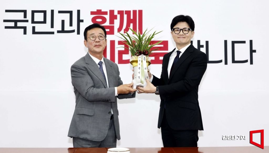 한동훈 국민의힘 대표가 24일 국회에서 홍철호 대통령실 정무수석을 접견하고 있다. 홍 수석은 윤석열 대통령이 보낸 취임 축하 난을 한 대표에게 전달했다. 사진=김현민 기자 kimhyun81@