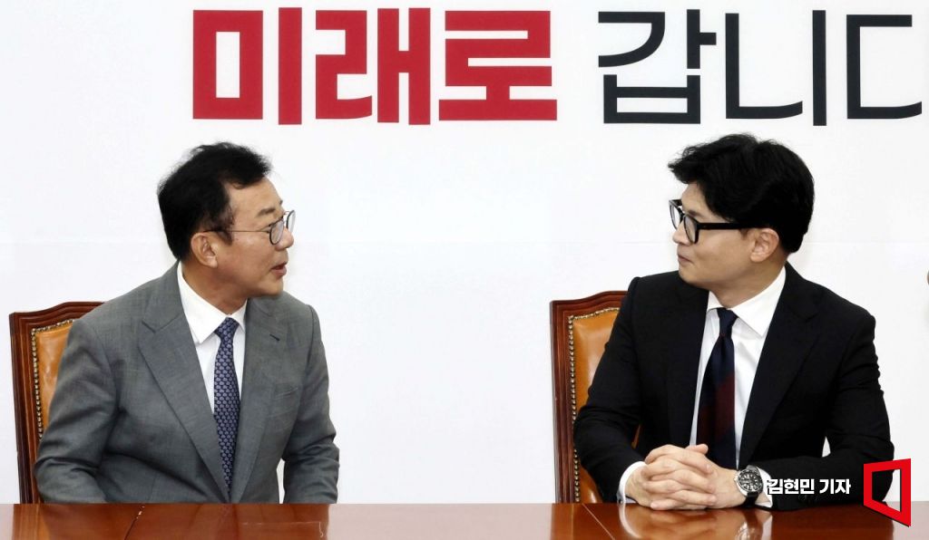 한동훈 국민의힘 대표가 24일 국회에서 홍철호 대통령실 정무수석을 접견하고 있다. 홍 수석은 윤석열 대통령이 보낸 취임 축하 난을 한 대표에게 전달했다. 사진=김현민 기자 kimhyun81@