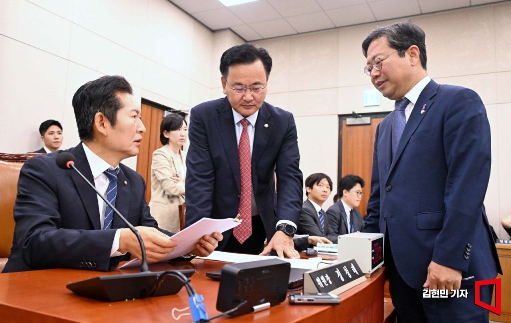 정청래 국회 법사위원장장이 24일 국회에서 열린 법제사법위원회 전체회의에서 유상범, 김승원 여야 간사와 대화하고 있다. 사진=김현민 기자 kimhyun81@