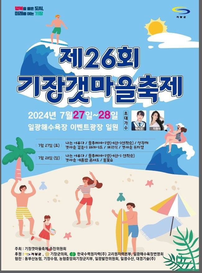 기장군(군수 정종복)은 오늘 27일부터 28일까지 양일간 일광해수욕장에서 기장갯마을축제 추진위원회(위원장 김부진) 주관으로 ‘제26회 기장갯마을축제’를 개최한다.
