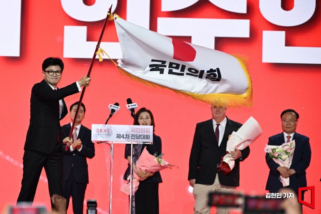 국민의힘 당 대표로 선출된 한동훈 후보가 23일 경기 고양 킨텍스에서 열린 제4차 국민의힘 전당대회에서 당 깃발을 흔들고 있다. 사진=김현민 기자 kimhyun81@