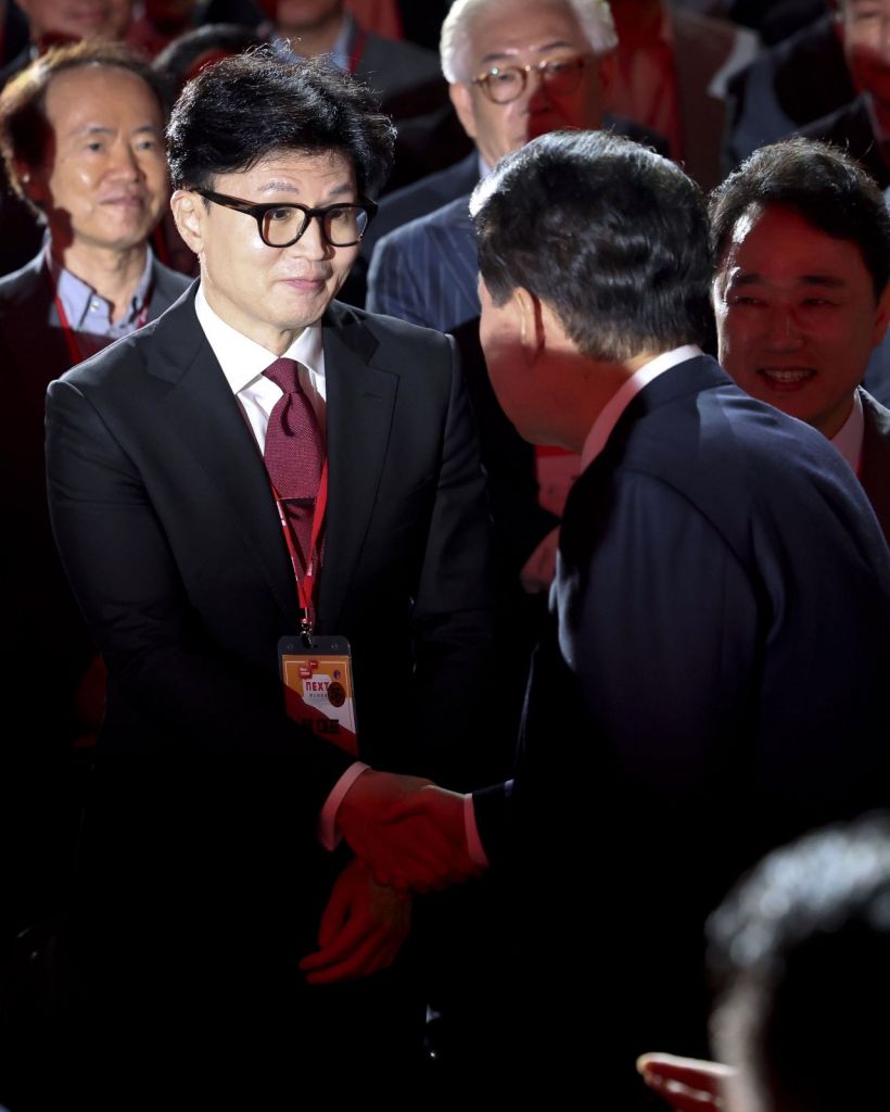 윤석열 대통령이 23일 오후 경기도 고양시 킨텍스에서 열린 국민의힘 제4차 전당대회에 입장하며 한동훈 당대표 후보와 인사하고 있다. [이미지출처=연합뉴스]