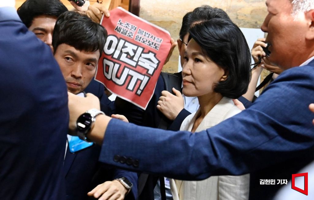 이진숙 방송통신위원장 후보자가 24일 언론단체 회원들의 항의를 받으며 서울 여의도 국회 과학기술정보방송통신위원회에서 열린 인사청문회에 출석하고 있다. 사진=김현민 기자 kimhyun81@