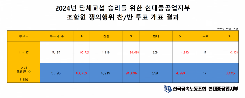 2024년 HD현대중공업지부 조합원 쟁의행위 찬반투표 개표 결과 [이미지출처=HD현대중공업 노조]