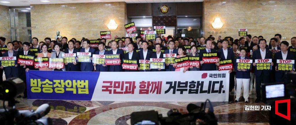 25일 국회 본회의장 앞 로텐더홀에서 국민의힘 의원들이 야당의 '방송4법' 강행 처리 시도를 규탄하고 있다. 사진=김현민 기자 kimhyun81@