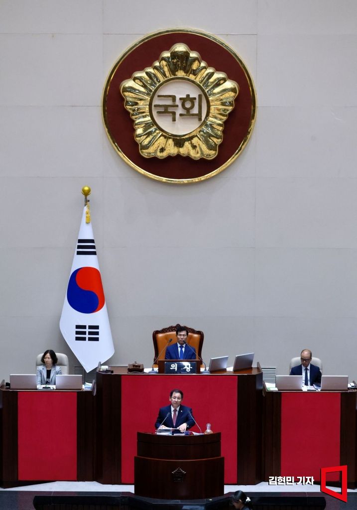 이상휘 국민의힘 의원이 26일 국회에서 방송통신위원회 설치 및 운영에 관한 법률 일부개정법률안에 대한 필리버스터(무제한 토론)를 이어가고 있다. 사진=김현민 기자 kimhyun81@