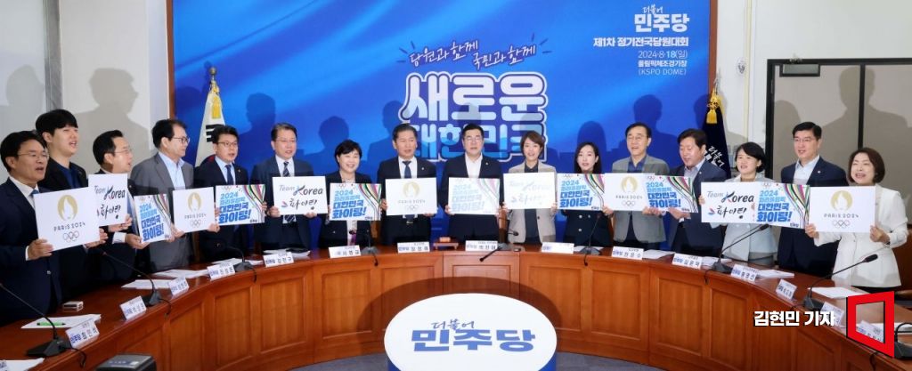 박찬대 당대표 직무대행 겸 원내대표를 비롯한 더불어민주당 지도부가 26일 국회에서 열린 최고위원회의에 앞서 파리올림픽 선수단의 선전을 기원하며 파이팅을 외치고 있다. 사진=김현민 기자 kimhyun81@