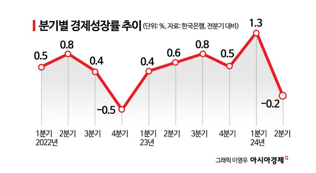 26일 한국은행에 따르면 올해 2분기 우리나라의 경제성장률은 -0.2%로 시장이 예상했던 0~0.1%보다 낮았다. 전년 대비로는 2.3% 성장했는데 이 역시 시장 예상치인 2.5%를 밑돌았다. 상반기 경제성장률도 2.8%로 한은이 지난 5월 경제전망에서 예측했던 2.9%를 하회했다.