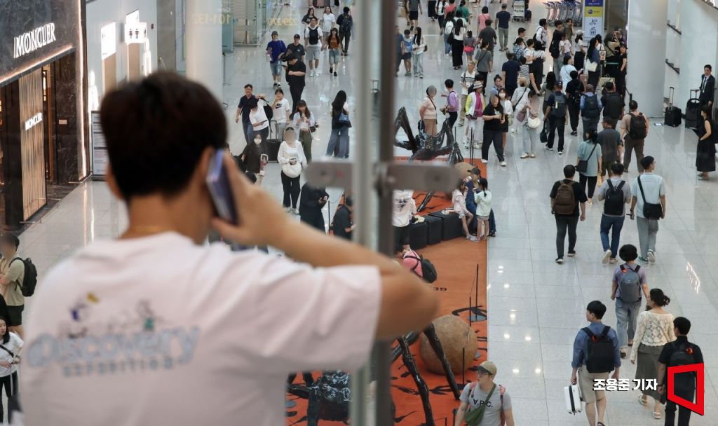 본격적인 여름 휴가철이 시작된 26일 인천국제공항 제1여객터미널에서 한 사람이 면세구역에 있는 가족과 통화를 하고 있다. 사진=조용준 기자 jun21@