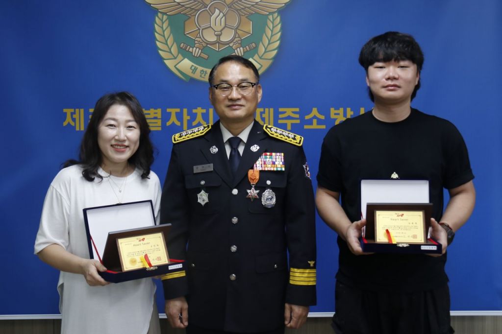 제주소방서(서장 양영석)는 전날 신속한 응급처치로 소중한 생명을 살린 일반인 2명에게 ‘하트세이버(Heart Saver)’ 인증서를 수여했다고 26일 밝혔다.