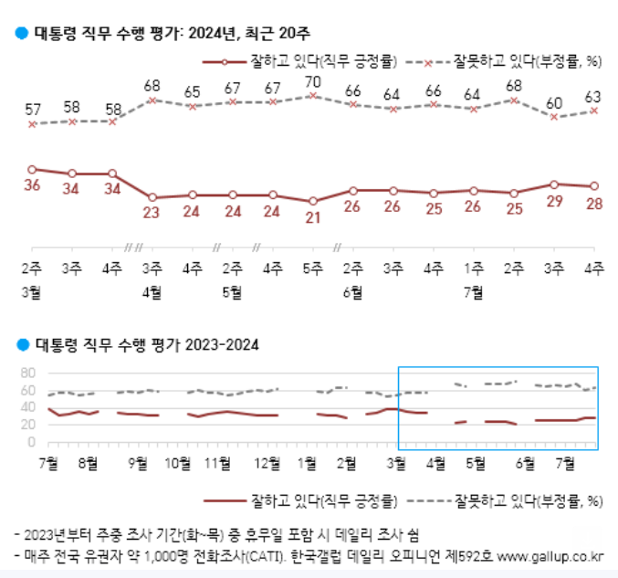 윤석열 대통령의 국정수행과 관련해서는 28%가 잘하고 있다고 긍정평가했다. 지난주 조사보다 지지율이 1%포인트 하락한 것이다. 잘못하고 있다는 부정평가는 3%포인트 상승한 63%로 나타났다.