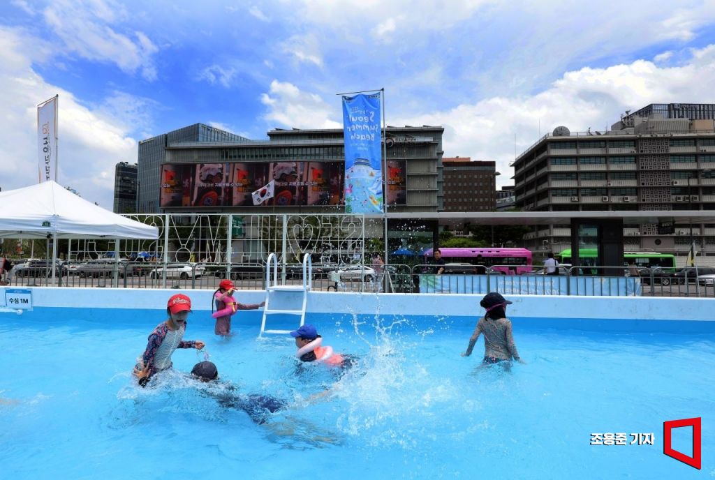 폭염이 기승을 부린 26일 서울 종로구 광화문광장에서 열린 '2024 서울 썸머비치' 행사에서 어린이들이 물놀이를 즐기고 있다. 사진=조용준 기자 jun21@