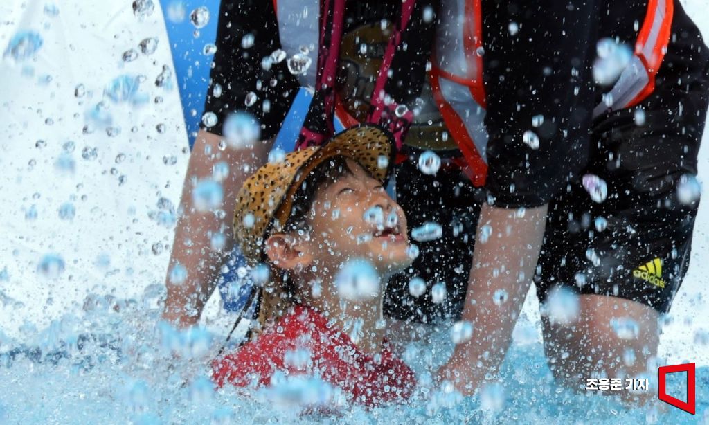 폭염이 기승을 부린 26일 서울 종로구 광화문광장에서 열린 2024 서울 썸머비치 행사에서 한 어린이가 워터슬라이드를 타며 즐거워 하고 있다. 사진=조용준 기자 jun21@