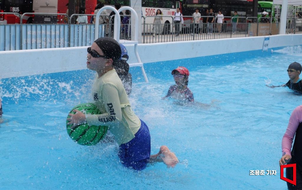 찜통더위가 기승을 부린 26일 서울 종로구 광화문광장에서 열린 '2024 서울 썸머비치' 행사에서 어린이들이 물놀이를 즐기고 있다. 사진=조용준 기자 jun21@