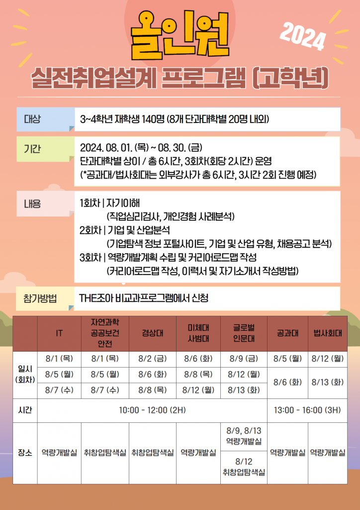 조선대 대학일자리플러스센터는 8월 1일부터 13일까지 국제관에서 고학년 실전취업설계 올인원 특강을 각 단과 대학별로 총 3회에 걸쳐 2시간씩 대면 진행한다고 26일 밝혔다.