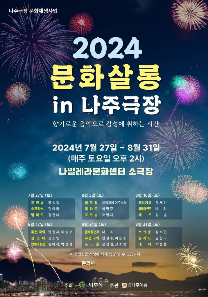 시는 ㈔한국예술문화단체총연합회 나주지회와 함께 퓨전 국악, 포크, 팝페라, 클래식, 발라드 등 다채로운 음악 장르를 넘나드는 공연을 주민들에게 선보일 예정이다.