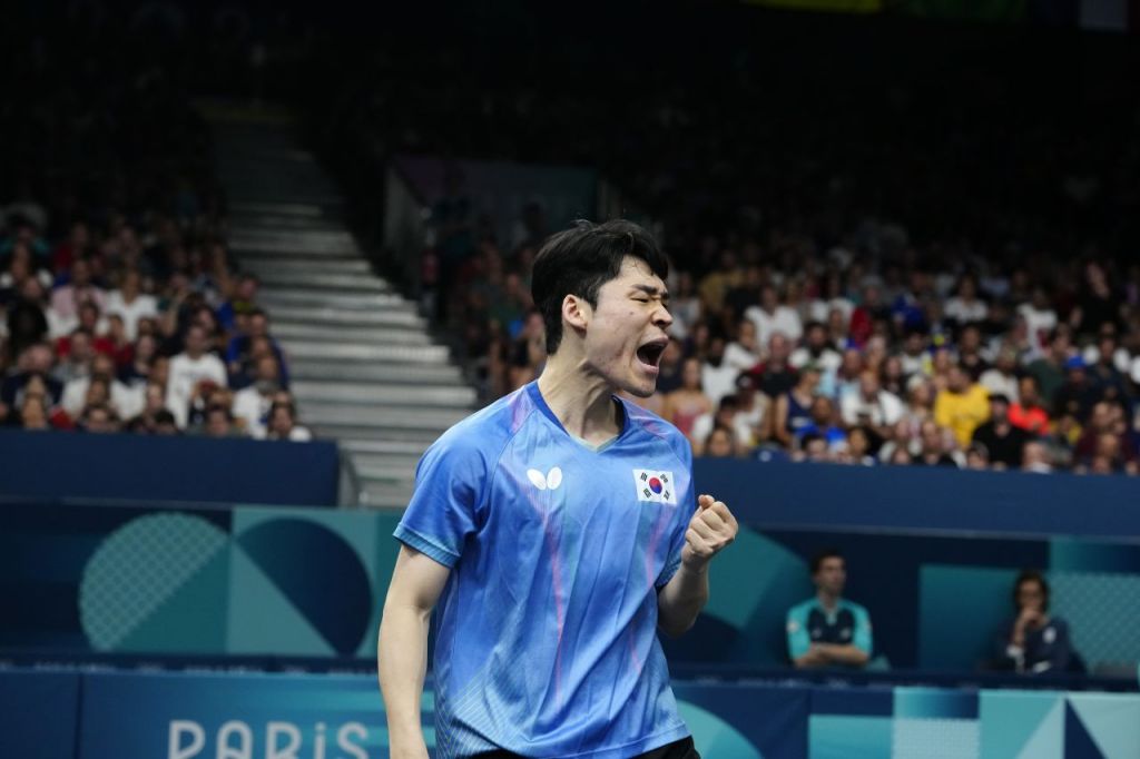 장우진은 31일 프랑스의 사우스 파리 아레나에서 열린 2024 파리올림픽 탁구 남자 단식 16강전에서 일본의 도가미 순스케를 상대로 승리를 거뒀다. [이미지출처=AP연합뉴스]