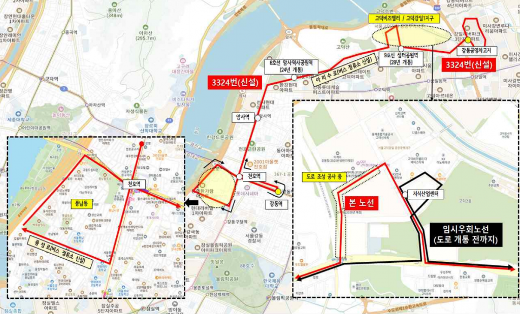 구는 이달 10일 개통을 앞둔 암사역사공원역과 대규모 업무단지인 고덕비즈밸리 입주 본격화, 하반기 입주를 앞둔 올림픽파크포레온(옛 둔촌주공) 등으로 대중교통 이용 수요가 집중될 것을 대비해 버스 노선 신설 및 조정을 위해 노력해왔고, 지난 12일 시내버스 3324번 신설 및 3323번 연장, 341번 증차 운행을 확정 지었다.