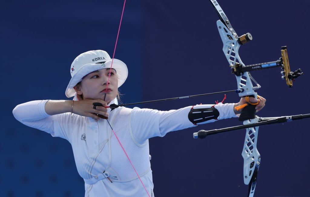 1일(현지시간) 프랑스 파리 레쟁발리드에서 열린 2024 파리올림픽 양궁 여자 개인전 영국의 페니 힐리와의 64강전에서 전훈영이 과녁을 조준하고 있다. [이미지출처=연합뉴스]