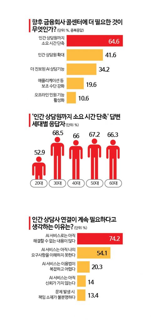 20·30대 등 디지털화에 익숙한 청년층에서도 AI보다 인간 상담원의 빠른 연결이 필요하다는 답변이 가장 많았다. 20대에서는 52.9%가, 30대에서는 68.5%가 '인간 상담원 상담까지 소요 시간 단축'이 가장 필요하다고 답변했다. 이는 50대(67.2%)·60대(66.3%)와 큰 차이가 없는 수준이었다. 금융소비자들이 디지털 활용 능력에 상관없이 AI보다 인간 상담사가 필요하다고 느끼는 점을 확인할 수 있는 대목이다.