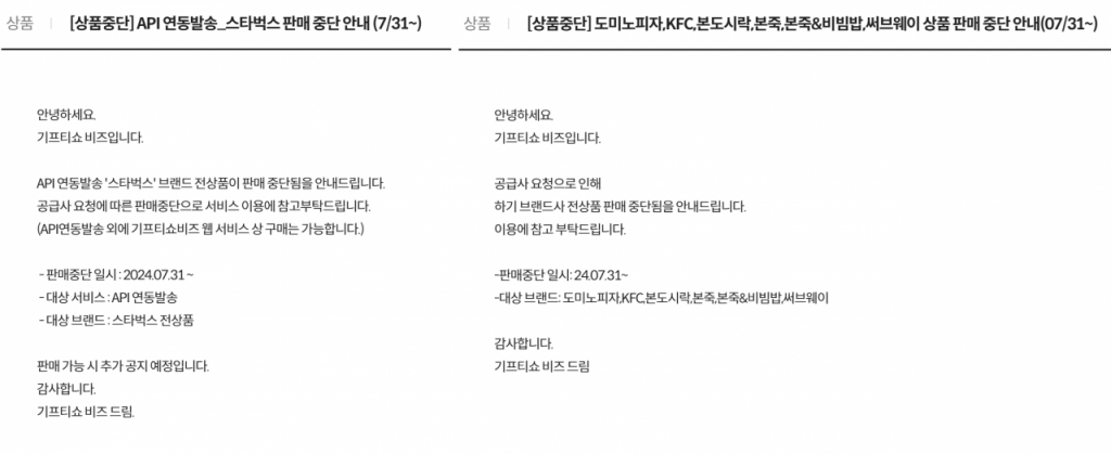 기프티쇼 비즈 외에도 쿠폰 발행 중단 조치는 오피스콘과 비즈콘 등 모바일 쿠폰 발행 서비스 전반으로 확대되고 있다. 비즈콘은 전날 "스타벅스 본사 지침에 따라 스타벅스 전 상품 일시 판매 중단될 예정"이라고 공지했고, 앞서 해피머니온라인상품권, 구글 기프트코드, 온라인문화상품권, 국수나무, 하남돼지집 등 브랜드에 대해 긴급 판매 중단에 나섰다.