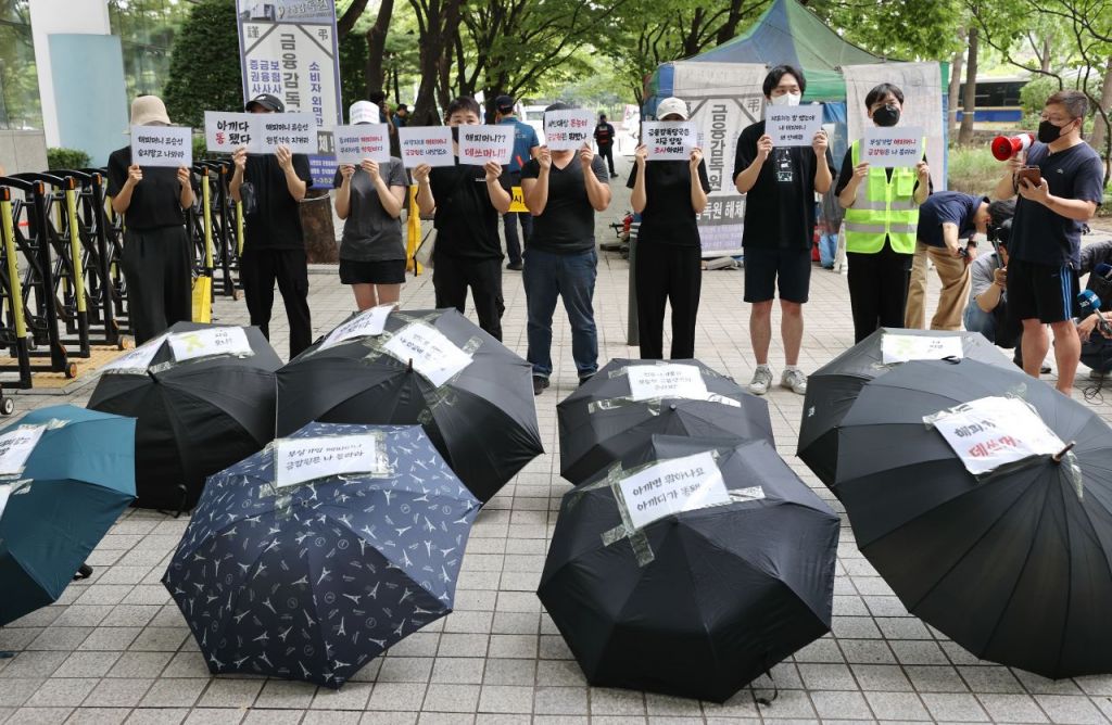 티몬·위메프 사태가 불거진 뒤 해피머니 상품권 사용이 불가능해지자 2일 오후 서울 여의도 금융감독원 앞에서 해피머니 상품권 구매 시민들이 환불 및 구제 대책을 촉구하는 '우산 집회'를 하고 있다. [이미지출처=연합뉴스]
