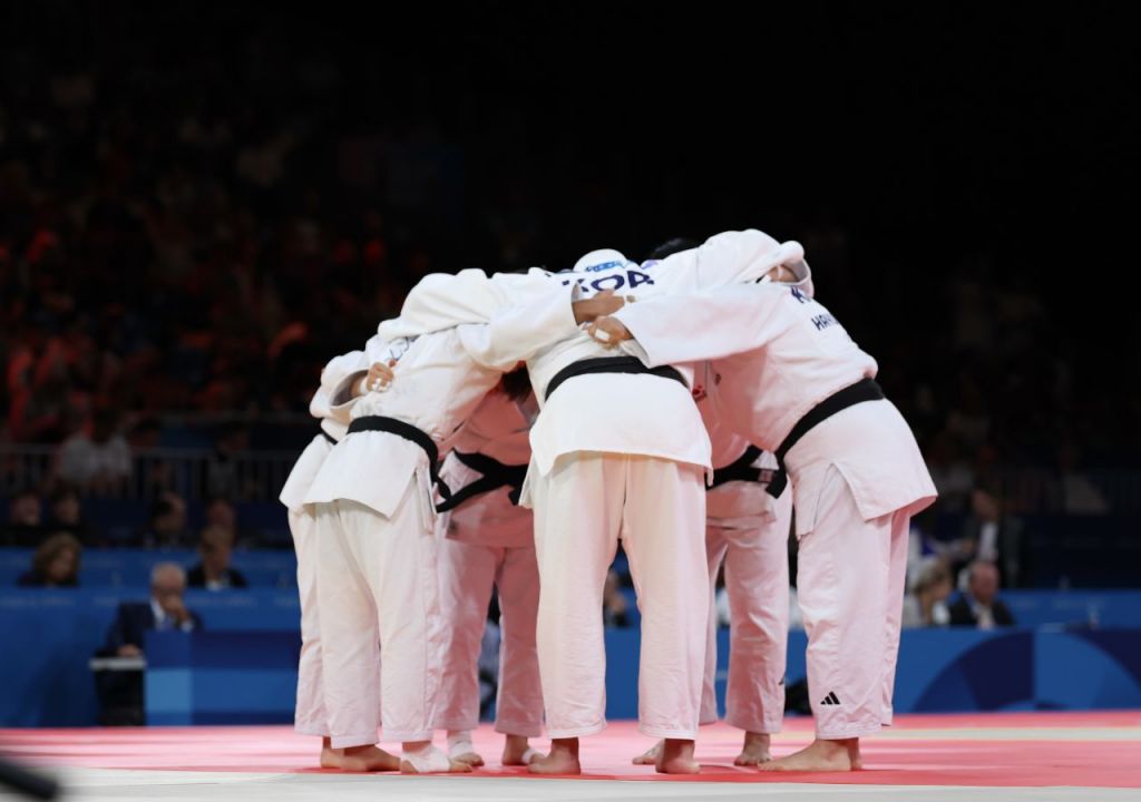 3일(현지시간) 프랑스 파리 아레나 샹드마르스에서 열린 2024 파리올림픽 유도 혼성단체전 16강전 한국과 튀르키예의 경기. 대표팀 선수들이 경기 전 어깨동무를 하며 서로를 독려하고 있다. [이미지출처=연합뉴스]