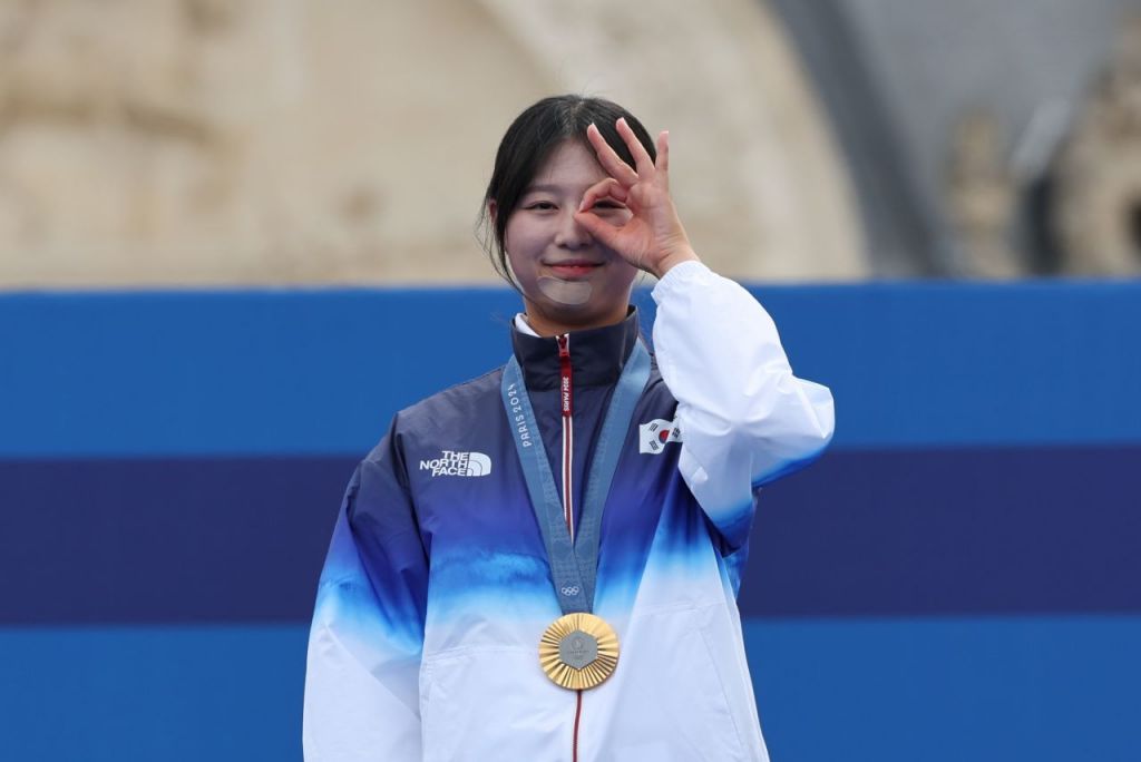 3일(현지시간) 프랑스 파리 레쟁발리드에서 열린 2024 파리올림픽 양궁 여자 개인전 결승에서 금메달을 차지하며 3관왕 달성에 성공한 임시현이 시상식에서 포즈를 취하고 있다. [이미지출처=연합뉴스]