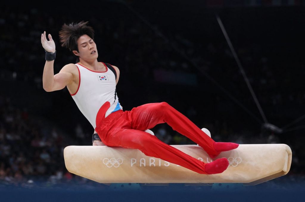 2024 파리올림픽 남자 기계체조 안마 결선에서 경기를 펼치는 허웅. [이미지출처=로이터연합뉴스]