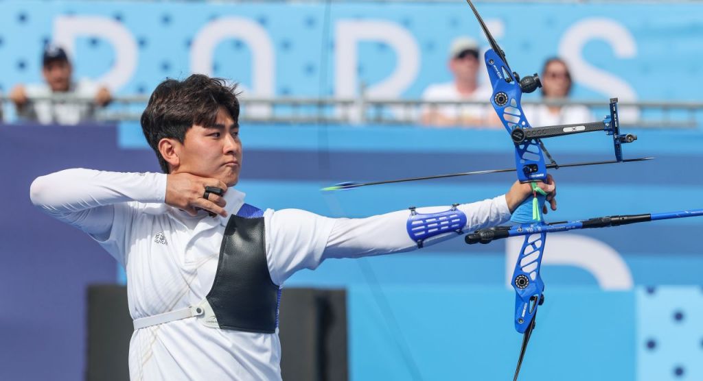 2024 파리올림픽 양궁 남자 개인전 콜롬비아의 산티아고 아르칠라와의 16강에서 한국 김제덕이 활시위를 놓고 있다. [이미지출처=연합뉴스]