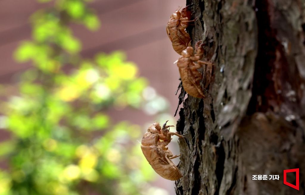 맴맴매...연일 폭염 속에 매미 소리도 더 우렁차다. 여름 곤충인 매미는 유충으로 지내다 우화를 거쳐 성충이 된 후 한달 안에 생을 마감한다. 매미 울음소리가 그치며 가을이 온다. 서울 강남의 한 숲속 나무에 매미들이 탈피 후 남긴 허물들이 옹기종기 매달려 있다. 사진=조용준 기자 jun21@