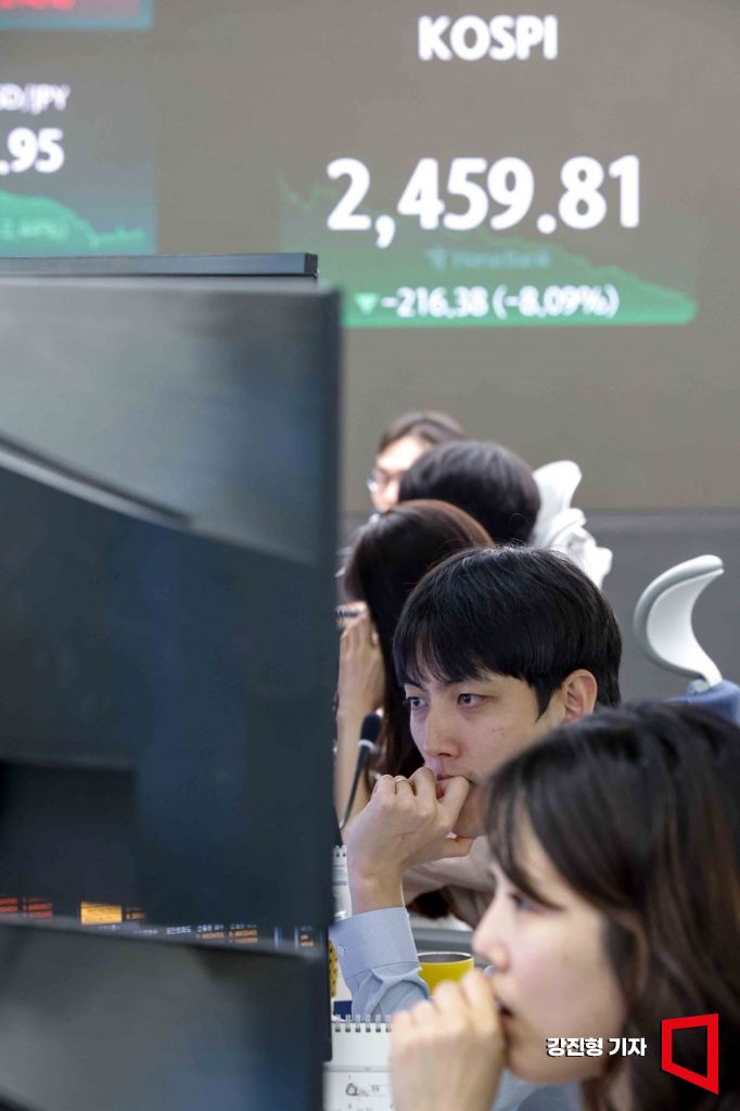 코스피와 코스닥 지수가 8% 이상 급락하며 두 시장에서 모두 서킷브레이커(CB)가 발동한 5일 서울 중구 하나은행 본점 딜링룸에서 딜러들이 업무를 보고 있다. 코스피, 코스닥 두 시장에서 함께 발동된 것은 신종 코로나바이러스 감염증(코로나19)이 유행하던 2020년 3월 13일 이후 4년 5개월 만이다.